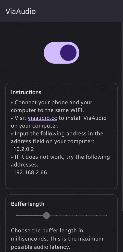 4. Launch ViaAudio on your phone. Then turn on the switch on the top.