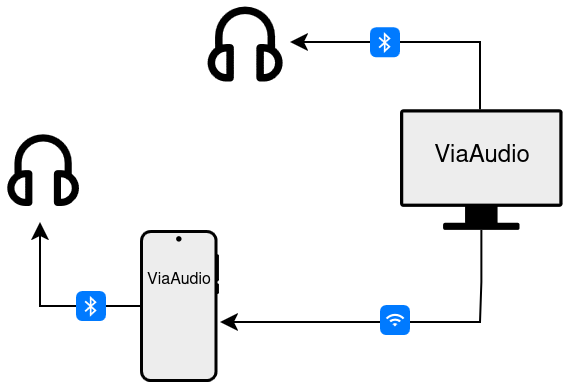 Your PC connects to the first headphone via Bluetooth directly. Your phone connects to the second headphone. ViaAudio streams the audio output from your PC to your phone via WiFi, so you can hear identical music on two bluetooth headphoens.